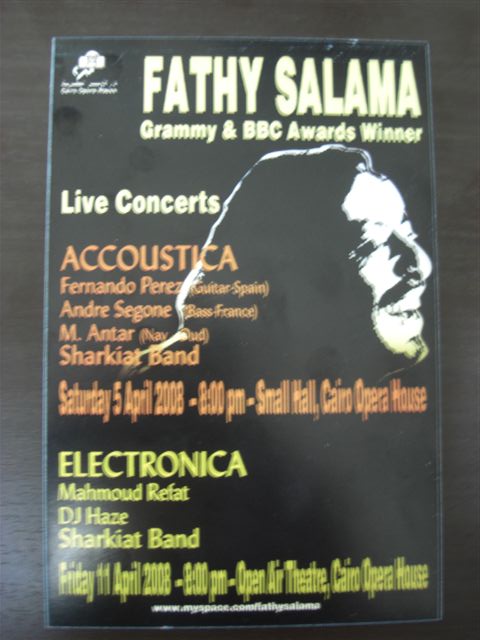 そして、夜の部。午後8時から、オペラハウス小ホールにて、知人が「エジプトの坂本龍一」と称して熱愛するミュージシャン、Fathy Salama(ファトヒー・サラマ)の公演を見に行った。かつてはポップスのコンポーザーとして、アムル・ディアブなど売れっ子シンガーに楽曲を提供してきたファトヒーは、近年自身の音楽世界を深め、上エジプトはヌビア民族の音楽をベースにしたフュージョンへと傾いていったという。そんな彼を一躍有名にしたのが、2004年にセネガルの巨匠ユッスー・ンドゥールが発表しグラミー賞を受賞したアルバム”EGYPT”だった。このアルバムに楽曲を提供し、アレンジなどを手がけることで、世間一般の知名度はそれほどでもないが、いまや知る人ぞ知る「通好み」のアーティストとなった。